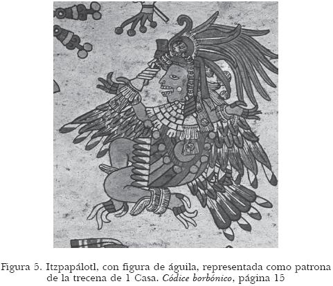 Según la Leyenda de los soles, la tzitzimitl muerta por Mímich era Itzpapálotl, y después de su muerte, el héroe reaparece bajo el nombre de Mixcóatl. Itzpapálotl es una advocación de la diosa madre, y su figura se traslapa con la de Cihuacóatl Quilaztli.53 Ambas pueden adoptar la figura de un águila, en lo cual se asemejan a los pájaros monstruosos en ocasiones, águilas que fueron derrotados por los héroes que habrían de convertirse en el sol y la luna (figura 5).