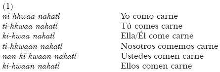 Obsérvese que contra las gramáticas prescriptivas del náhuatl, (5) viola la distribución complementaria que establece que cada sustantivo, cuya raíz termina con una vocal, tomará el sufijo absolutivo -tl, mientras las raíces que terminan en consonante tomarán tli, como en: