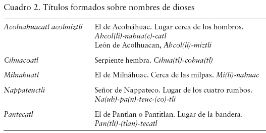 En cierto número de casos, el título consistía en el nombre del dios (cuadro 2). Desde luego, esto proporciona una prueba directa que el cargo era llevado por el teohua, quien cuidaba el templo, encarnaba la deidad, revestía sus atuendos y daba muerte a sus sacrificados.