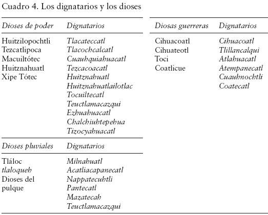 Los más altos de los títulos estaban ligados a las deidades del poder, Huitzilopochtli, Tezcatlipoca y Huitznáhuatl.7 El tlacochcalcatl (y el tlacateccatl que le era estrechamente asociado) se vinculaban con Huitzilopochtli y Tezcatlipoca. El cuauhquiahuacatl estaba adscrito al tlacochcalco céntrico dedicado a los mismos dioses, a los cuales se añadía Macuiltótec, uno de los "dioses cinco" que representaban a los guerreros muertos. El tezcacoacatl estaba a cargo de otro tlacochcalco, cuya advocación es menos conocida. Sin embargo, es verosímil que se trató de Huitzilopochtli, puesto que un hombre llamado tezcacoacatl fue uno de los cuatro cargadores de este dios durante la peregrinación (López Luján, 2006, I: 280). Los huitznahuacatl y huitznahuatlailotlac fueron asociados a Huitzilopochtli, el triunfador de los 400 huitznahuas representados por el dios Huitznáhuatl; asimismo se encontraban bajo la advocación de Tezcatlipoca, según la cita del Códice Magliabechiano (nota 7). El tocuiltecatl es un dignatario mal conocido, evocado en el himno al Huitznahuac Yaotl (guerrero de Huitznáhuac), otro nombre de Tezcatlipoca (FC II: 223). Después de mencionar el tlacochcalco, este canto contrasta el Huitznahuac teohuaqui (sacerdote teohua de Huitznáhuac) y el Tocuilitla teohuaqui (sacerdote teohua de Tocuilitla). Por lo tanto podemos asociarlo con Tezcatlipoca. Por fin, el teuctlamacazqui era encargado de Huitzilopochtli. Llegamos así a un total de ocho cargos vinculados con los dioses del poder.