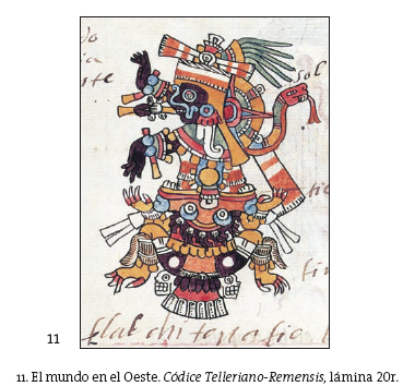Relacionada más específicamente con el Oeste, el lugar donde muere periódicamente el sol, una imagen diafórica del mundo (fig. 11) representa a Tláloc/la luna, el sol, el tiempo (la serpiente), la tierra: Tlalticpac, encima de las fauces de Tlaltecuhtli y el inframundo: Mictlan.