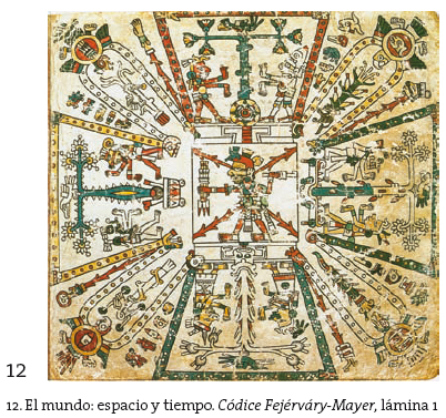 En términos eidéticos-iconográficos, una tetralogía espacio-temporal más específicamente calendárica fue expresada de diversas maneras. La lámina I del Códice Fejérváry-Mayer constituye un ejemplo de ellas (fig. 12). En esta imagen, los espacios-tiempos constitutivos del mundo, están reunidos en torno a un centro axial en el que figura el dios del fuego, aquí en su advocación de Tezcatlipoca.