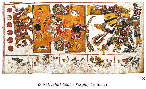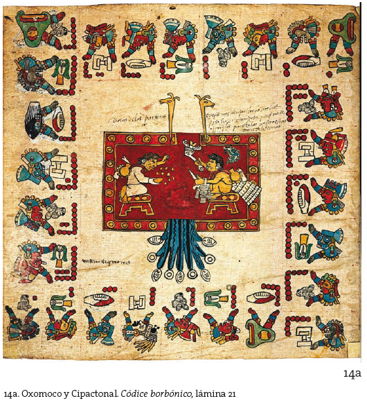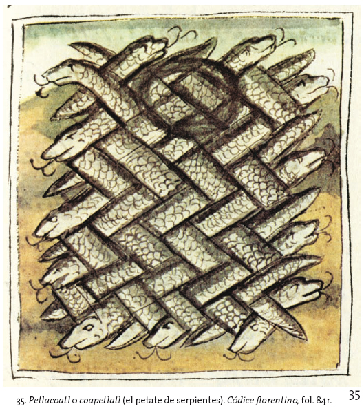 132 El hermoso tocado de plumas llamado petlacoatl que lleva un anciano en el baile propedéutico al sacrificio de la diosa Huixtocíhuatl, en el mes tecuilhuitontli podría ser de hecho una sublimación plumífera de este enredo de serpientes (petlacoatl) y remitir, en última instancia, al mar.