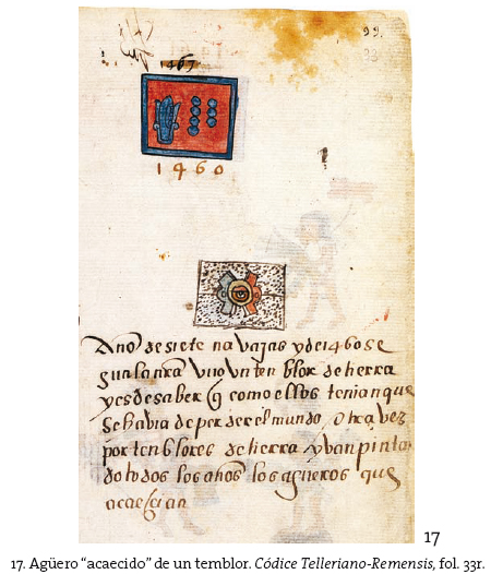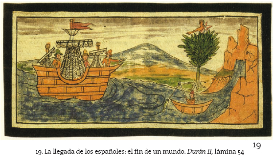 Es en este contexto cronológico-adivinatorio que se sitúa la llegada de los españoles en 1519, y en el que debemos ubicar los signos premonitorios que la anunciaban. Cabe preguntarse, en la parte liminar de este artículo, si la irrupción portentosa de "seres extraños" en Tlauhcopa (el lugar de la luz), el Este, lugar hierofánico por excelencia de los pueblos nahuas, constituyó el fin del mundo, un fin del mundo o el fin de un mundo, si consideramos las consecuencias catastróficas que tuvo para las civilizaciones mesoamericanas.