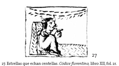 Todos tenían muy grande miedo y estaban esperando con mucho temor lo que acontecería, porque decían y tenían esta fábula o creencia entre sí, que si no se pudiese sacar lumbre que habría fin el linaje humano, y que aquella noche y aquellas tinieblas serían perpetuas, y que el sol no tornaría a nacer o salir; y que de arriba vendrían y descenderían los tzitzimime, que eran unas figuras feísimas y terribles, y que comerían a los hombres y mujeres.