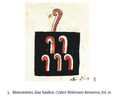Los nemontemi (días baldíos o "sobrados") (fig. 3) generaban temor y angustia. A diferencia de los 360 días que los precedían, estos días no estaban bajo el amparo de una divinidad específica. "Acabado este mes (Izcalli) los cinco días que se siguen son sobrados de los trescientos y sesenta ya dichos, los cuales todos de veinte en veinte están dedicados a algún dios. Estos cinco días a ningún dios están dedicados, y por eso los llaman nemontemi, que quiere decir que están por demás, y teníanlos por aciagos".20