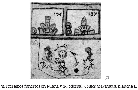 Este texto constituye la lectura de un libro pictográfico como lo revela el tenor algo paratáctico del discurso verbal.11 Las peripecias correspondientes a la creación del fuego establecen, mediante la subida del humo en 1-Tochtli (1-Conejo), la región cardinal faltante: el Sur, la tetralogía espacial subsecuente y lo que será el centro ígneo del mundo, axis mundi del movimiento vital por venir, en el año 2-Ácatl (2-Caña).