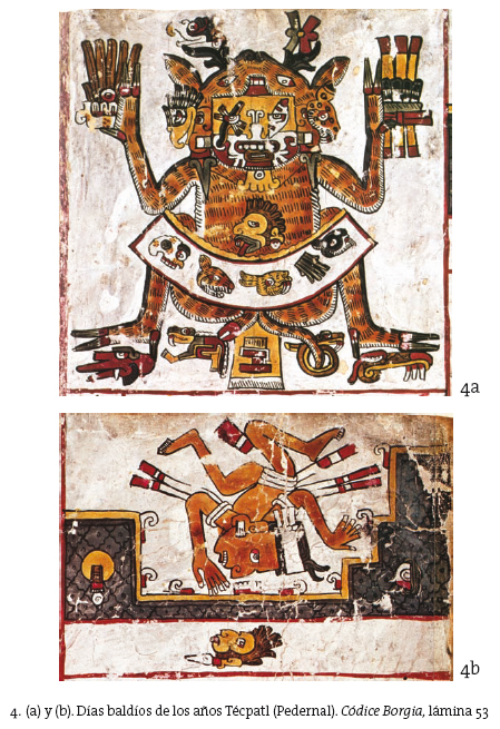 Por otra parte, el fin periódico de las unidades constitutivas de este macrociclo: los años, era también anticipado y vivido en el temor. Al fin de cada ciclo anual, un lapso de cinco días "baldíos" o "sobrados" llamados nemontemi en náhuatl (figs. 3 y 4), uayeb en maya yucateco, permitía una aprehensión difusa de lo que se perfilaba como un abismo en el que amenazaba con caer el tiempo, arrastrando a todos los que en él vivían. Estos días estaban excluidos del calendario anual de las veintenas (cempohuallapohualli) conjugando asimismo los fines prácticos de un cómputo de los meses con la necesidad imperativa, en el contexto indígena, de integrar el caos en una temporalidad culturalmente controlada.2