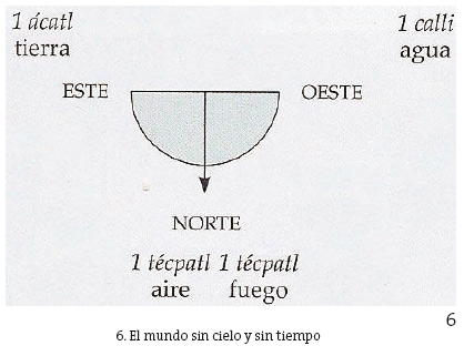 Según lo plantea el mito hasta este momento, si bien ninguna edad llegó a constituir un mundo viable, esbozaron lo que sería su fundamento espacio-temporal. Además de los cuatro elementos se establecieron tres regiones cardinales: dos de ellas situadas sobre lo que sería después el eje equinoccial: Este-Oeste. Una de ellas ocupaba lo que sería un día el nadir del curso solar mictlampa: el Norte (fig. 6).