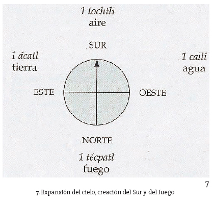 Según la "Leyenda de los soles", después de cuatro eras infructuosas que no pudieron instaurar un cosmos, dos personajes, Tota y Nene, encerrados por Tezcatlipoca en el tronco de un árbol, y que por tanto se salvaron del diluvio, decidieron asar peces una vez que hubieron bajado las aguas. Este hecho que podría parecer anodino tiene un valor cosmogónico, ya que el humo, resultante de la integración del agua (peces) y del fuego, sube al cielo (es decir eleva el cielo) para consagrar el punto cardinal faltante: el Sur. En efecto, el Este (1-Ácatl/Tierra), el Oeste (1-Calli/Agua) y el Norte (1-Técpatl/Fuego) estaban debidamente extendidos, pero la era "viento" (aire) potencialmente uránea, ostentaba el año 1-Técpatl, al igual que la era "fuego". Esta "gemelaridad" espacio-temporal, manifiesta en la duplicación del 1-Técpatl, no permitía que se acabara de configurar el cosmos. Con dos eras situadas al Norte, el mundo era esencialmente infratelúrico, no era viable en términos cosmológicos ya que faltaba un punto cardinal y no había cielo.