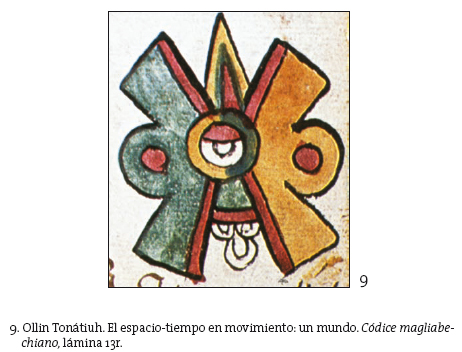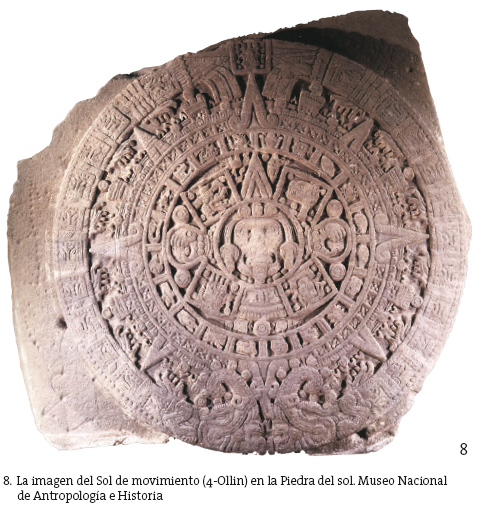 El texto pétreo de la llamada Piedra del sol (fig. 8) confirma la consecución espacio-temporal aquí referida. En efecto, la fecha 13-Ácatl, situada en el Este, entre los cascabeles de las dos serpientes, corresponde al nacimiento del sol, el fuego celestial, a partir del fuego telúrico en el que Nanahuatzin y luego Tecuhciztécatl se habían echado. Tonatiuh y Xiuhtecuhtli, el sol y el fuego, se "co(n)-funden" en el centro de la piedra calendárica ya que se encuentran sobre un eje vertical implícito que pasa por el centro ígneo de la imagen del movimiento ollin.