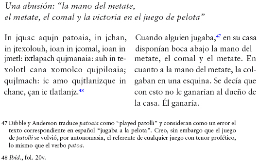 47 Dibble y Anderson traduce patoaia como "played patolli" y consideran como un error el texto correspondiente en español "jugaba a la pelota". Creo, sin embargo que el juego de patolli se volvió, por antonomasia, el referente de cualquier juego con tenor profético, lo mismo que el verbo patoa.