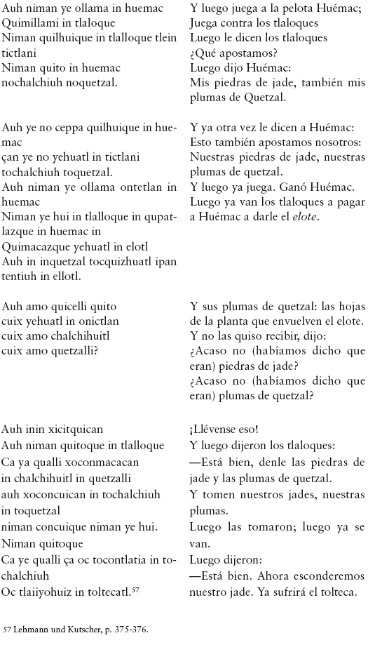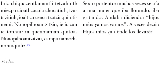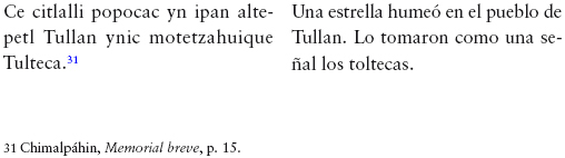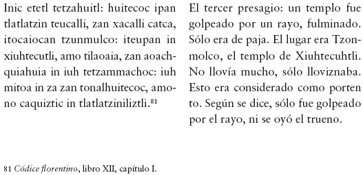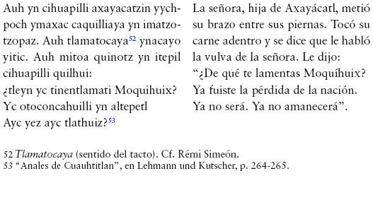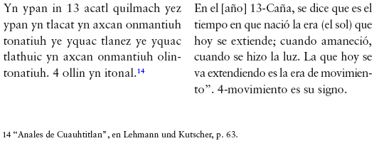 113 "Anales de Cuauhtitlan", en Lehmann und Kutscher, p. 291; Cf. León-Portilla, "Las profecías del encuentro. Una apropiación mesoamericana del otro", en De palabra y obra en el Nuevo Mundo, p. 240.