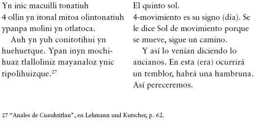 Este quinto sol nació en un año 13-Ácatl (13-Caña),4 según mitos nahuas, y podría no ser "eterno" aun cuando los mecanismos cíclicos de la temporalidad indígena lo retroalimentan periódicamente. De hecho, algunas profecías indican, sin mencionar una duración específica, que el mundo 4-Ollin, el Sol de movimiento, acabará con un terremoto y una tremenda hambruna.5 El fin catastrófico de este mundo coincidirá, sin duda, con el comienzo de otro, el cual a su vez llegará a su fin...