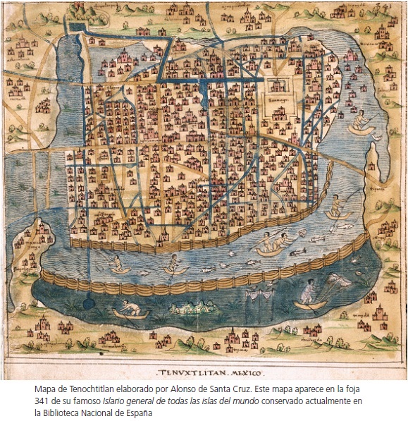 Es en el Islario donde incluye las noticias sobre la conquista y la descripción de la ciudad de Tenochtitlan. Alonso de Santa Cruz recibió algún tiempo cercano a 1550 un mapa de la ciudad de México que había solicitado Carlos V. Ese mismo mapa que mucho interesó a Carlos V, le sirvió a Santa Cruz para preparar por su cuenta otro más esquemático que incluyó en su Islario. En el "Mapamundi" que también integró a su obra hay además una anotación suya en que se alude a Hernán Cortés como descubridor de la California. Al publicar el texto que aquí se presenta se busca dar a conocer otro punto de vista en torno a lo que fue la conquista y la antigua ciudad de México-Tenochtitlan. El texto procede del Islario de Alonso de Santa Cruz conservado en la Biblioteca Nacional Española, y reproducido en Alonso de Santa Cruz y su obra cosmográfica, 2 v., edición de Mariano Cuesta, Madrid, Instituto Gonzalo Fernández de Oviedo, 1983, p. 346-357.