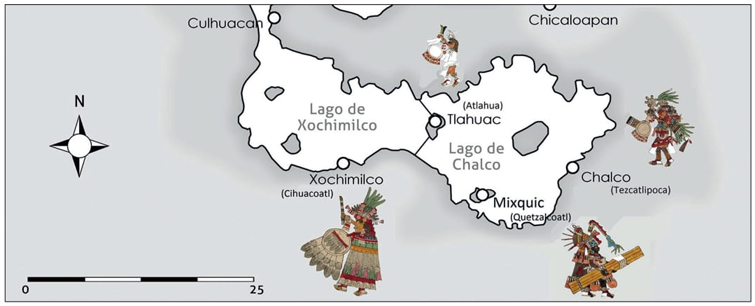 Finalmente, es posible proponer que las divinidades cuya presencia ha sido destacada como un elemento peculiar en el ciclo de las veintenas de nuestro códice de referencia -Cihuacoatl, Quetzalcoatl, Tezcatlipoca y Atlahua- se corresponden también con los dioses tutelares de las ciudades ubicadas en el sur de la cuenca: Xochimilco, Mixquic, Chalco y Cuitlahuac (mapa 3).
