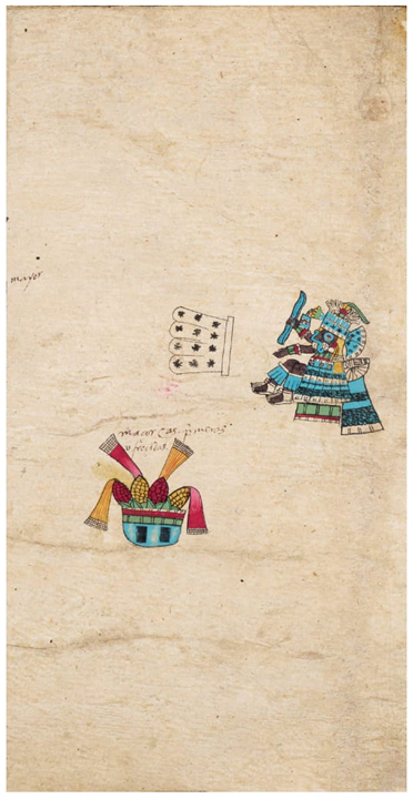 Figura 1 Veintena de Xilomanaliztli. El dios Tlaloc está acompañado por una ofrenda de papeles amatetehuitl y por un recipiente de mazorcas rojas y amarillas.