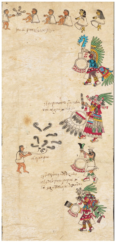 El uso de la palabra “Xilomanaliztli” está presente en el Códice Tudela (Batalla Rosado 2009, 91-92) y, según el comentarista, se relacionaría con la siembra del maíz. Asimismo, se mencionan numerosos sacrificios de niños y de mujeres cuyos corazones eran extraídos y la sangre utilizada para untar la boca de la efigie del dios (“Costumbres, fiestas, enterramientos y diversas formas de proceder de los indios de Nueva España” 1945, 38; Cervantes de Salazar 1914, 36).
