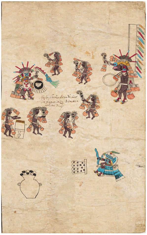 Figura 3 Veintena de Etzalcualiztli. Mitad superior: Quetzalcoatl y Xolotl bailando. El primero está rodeado por sacerdotes que comparten parte de sus atavíos; uno de los sacerdotes toca un huehuetl. Mitad inferior: Tlaloc está acompañado por una ofrenda de papel amatetehuitl y por una olla de maíz y frijoles, la cual alude al nombre de la fiesta.