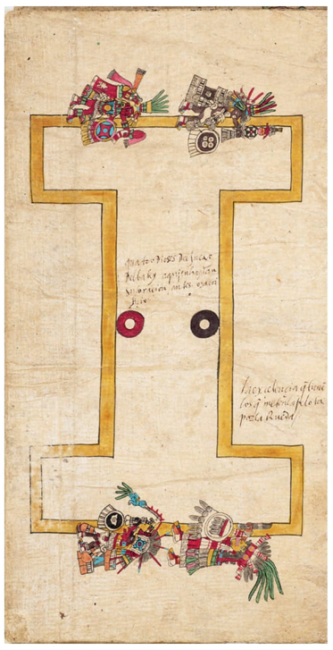 Figura 4 Veintena de Tecuilhuitontli. En una cancha de juego de pelota se enfrentan dos equipos: Quetzalcoatl y Cihuacoatl, en la parte inferior, y Cinteotl e Ixtlilton en la parte superior.