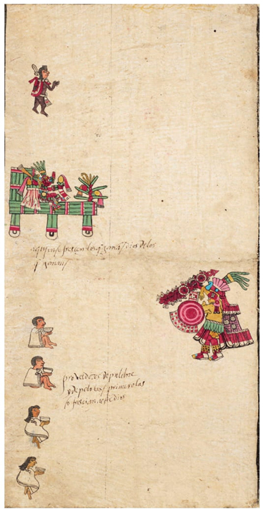Figura 5 Veintena de Huey Tecuilhuitl. Cinteotl, sentado en la Cincalli, está acompañado por un noble (parte superior), por dos hombres y dos mujeres que consumen alimentos (parte inferior) y por Xipe Totec (a la derecha).