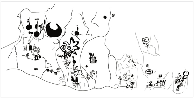 Como hemos visto, la compleja relación entre los dioses ha sido analizada por varios estudiosos, quienes incluso han propuesto clasificaciones para estas deidades (Nicholson 1971); pero en más de una ocasión los númenes escapan de este ordenamiento, por lo tanto, el ejercicio que aquí se propone gira en torno a comprender la fluidez de estas relaciones a partir de las imágenes rupestres del norte de Morelos, concibiéndolas como parte de un aparato estético específico vinculado a una cosmovisión prehispánica nahua. Las imágenes que se analizan forman parte de un complejo en el que sus significaciones pueden ser múltiples, de acuerdo con el contexto. Aunque hay una serie de simbolismos que parecen persistir, en este primer momento mi interés se centra en las regularidades que dan cohesión regional al arte rupestre.