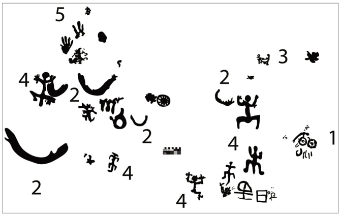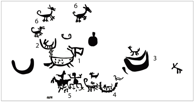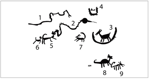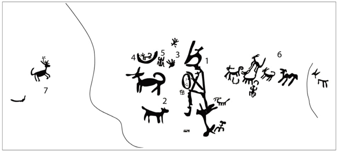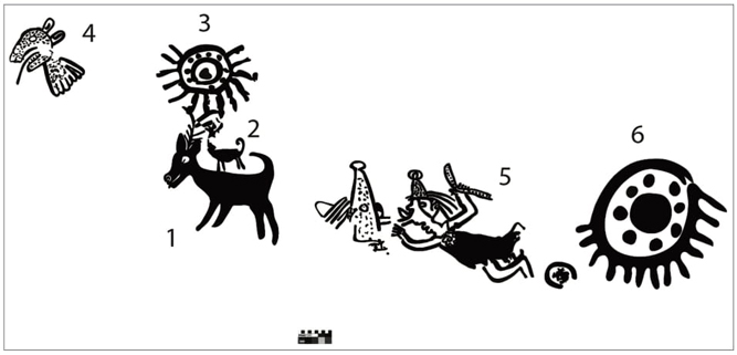 En el panel 5 de La Fundidora existen al menos ocho zoomorfos con trazos y posturas distintos; en su mayoría, se dirigen hacia la región sur del panel acompañados por un batracio, dos lacértidos y dos lunas crecientes (figura 14). En el centro se encuentra un personaje con cuerpo rectangular y cabeza o tocado similar a los de las imágenes de venados que hemos visto en otros lugares de la región (1). El cuerpo del sujeto tiene dos líneas que cruzan su torso para formar una “X”, mientras que uno de sus brazos sostiene restos de una rodela. ¿Es este personaje un hombre-venado o Mixcóatl? Visualmente, es la figura más importante en la escena, debido a su tamaño y posición. Frente a él hay dos venados (2) y arriba dos manos pintadas (3), así como un cánido de patas cortas dentro de la luna creciente (4). A su lado hay una figura en la postura de mamazohuticac, que parece un batracio (5). Atrás se encuentra un grupo de animales juntos (6), parece que el personaje los resguarda. Al frente, junto a una luna creciente, está un venado macho (7) hacia el que el personaje dirige su cuerpo. ¿Es su presa?