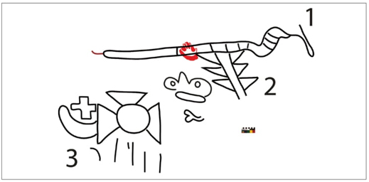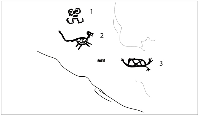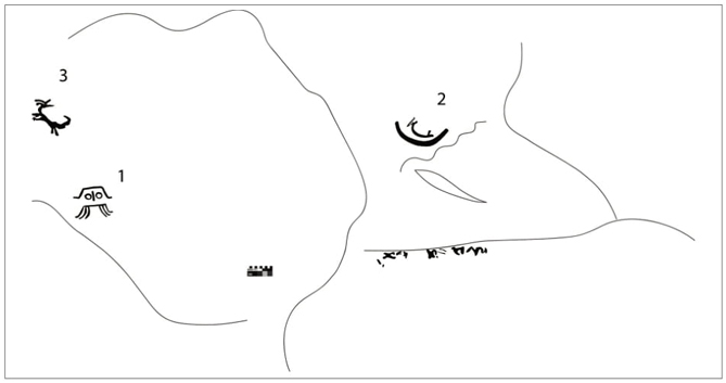 El sitio de La Ventana, en Amatlán, se ubica en una covacha a la mitad del cerro del Tambor, en Tepoztlán, a la que es posible ingresar sólo si se encorva el cuerpo, como si fuera la preparación para entrar en otra realidad, representada por el paisaje que se despliega frente a los ojos del visitante, un paisaje en el que la abundancia de vegetación y las montañas contrastan con las rocas que se observan antes de entrar (López Austin 2003, 172-201).2 Es posible que el paisaje recuerde el mítico cerro de los mantenimientos. Las imágenes en la repisa son las de un rostro de Tláloc (1), que está junto a un venado (2) y una tortuga o caracol (3), este último quizá como un aspecto del monstruo de la tierra (figura 10).