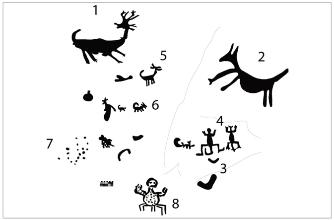Las imágenes del venado se distribuyen en distintos sitios; entre éstos, La Fundidora es el lugar que hasta el momento alberga la mayor cantidad de cérvidos. En la parte superior del panel 3 hay al menos seis zoomorfos, entre los que destacan dos de mayor tamaño (figura 12). Uno de ellos (1), probablemente como signo de madurez del macho, porta una cornamenta; a la derecha aparece otro animal con el vientre abultado (2), y nos preguntamos si se trata de una hembra. Debajo de esta figura hay elementos telúricos, como la luna (3) y los reptiles (4); mientras que cerca del animal con cornamenta, en la parte de abajo, se sitúan un venado (5) y un cánido (6), así como una serie de 18 puntos (7). Hacia el arranque de la roca, la imagen que une ambos espacios es un batracio (8) con puntos en su interior y en posición de mamazohuiticac. Puede ser que la posición de las imágenes en el panel refiera un momento específico del periodo de apareamiento de los cérvidos, porque a éstos también se les relaciona con los excesos sexuales, excesos que, en la cosmovisión prehispánica, si bien pueden provocar inestabilidad, también generan fertilidad (Olivier 2014, 144).
