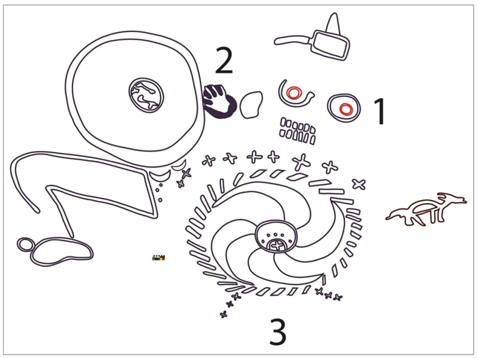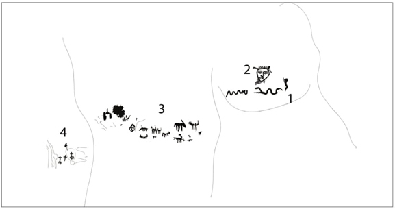 Las diversas etapas pictóricas reflejan el devenir del sitio a través de las intervenciones que experimentó durante el periodo prehispánico y, posiblemente, durante la Colonia. Se identifican cinco intervenciones distintas basadas en los trazos y la superposición de elementos, lo que sugiere momentos cronológicos diferentes que distinguen este panel del resto de los aquí analizados. El segundo momento de pintura muestra a la serpiente en una escena ubicada al pie de la roca (figura 2a), en la que la imagen principal es la serpiente que está en la región celeste (1) y se une con la tierra a través de una planta de maíz (2); junto a ellas se dibujó un posible cosmograma y una luna creciente (3).