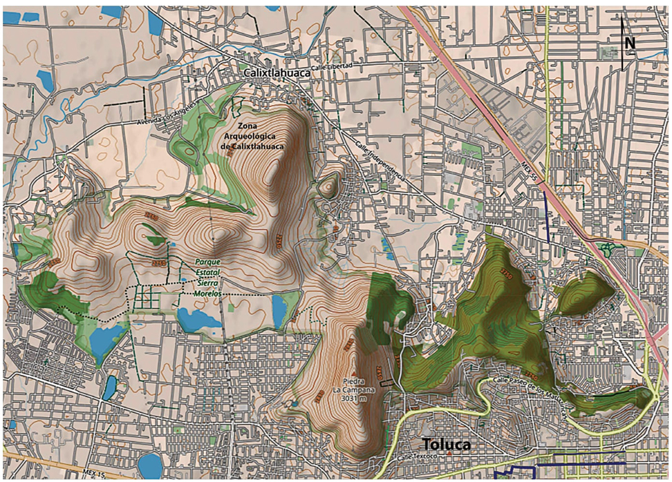 La zona arqueológica de Calixtlahuaca,5 ubicada a 9 km al norte de Toluca, actual capital del estado de México, constituye, junto con Teotenango, uno de los asentamientos humanos de origen prehispánico más importantes de este valle. Se sitúa sobre la ladera norte del cerro Tenismó,6 el cual cuenta con varias fuentes de agua o manantiales perennes aún vigentes,7 los cuales se suman al río Tejalpa que nace en la ladera norte del Nevado de Toluca y cruza la zona en dirección este, hacia el río Lerma, del cual es un afluente (mapa 1).