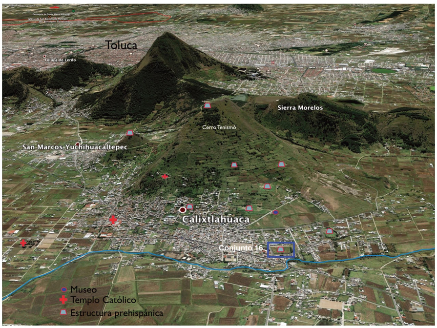 Figura 1 Referencia fotográfica en 3D de la zona arqueológica de Calixtlahuaca sobre el cerro Tenismó, en la sierra de Toluca. Se destacan los monumentos arqueológicos principales y el Conjunto 16 en la margen del río Tejalpa.
