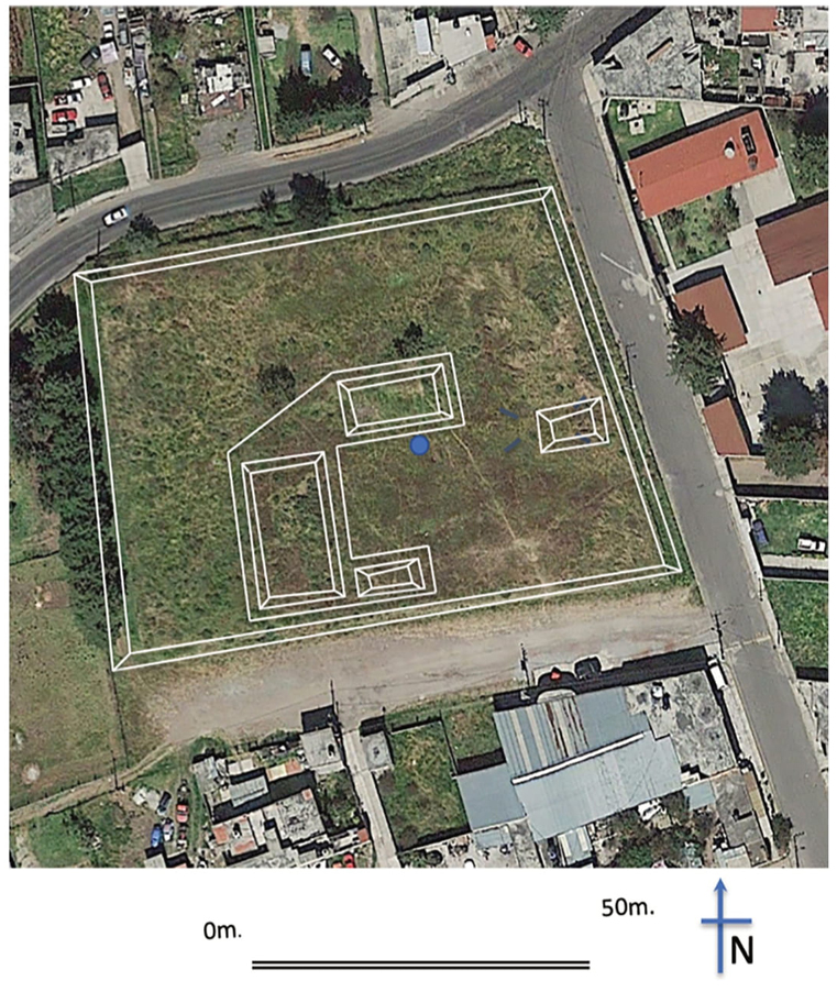 En cuanto a sus características arquitectónicas, sobresale su planta relativamente cuadrangular, que se eleva un metro por arriba del aparente nivel de desplante, dando forma a una plataforma construida fundamentalmente con bloques irregulares de roca andesítica, y en menor cantidad, con tezontle. Sobre ella puede distinguirse con facilidad un montículo alargado, en forma de L (figuras 2 y 3), que en el sector poniente presenta evidencia de un gran pozo de saqueo, mientras que en el sector norte existe evidencia de una construcción virreinal de corte probablemente religioso, conocida como “la capilla vieja” por los pobladores del barrio, en la que, según la tradición oral, se rendía culto a la virgen de Guadalupe.
