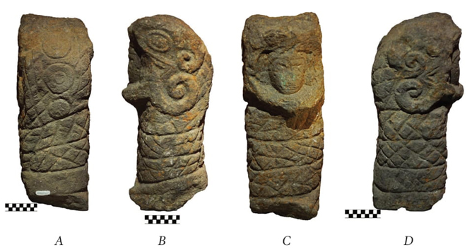Otros atributos sobresalientes se observan en la parte posterior de la pieza, donde pueden verse cuatro círculos ordenados en forma vertical, uno debajo del otro, dispuestos en el interior de un trazo oval inscrito en un rombo (figura 4A). En los extremos laterales están los ojos del reptil, uno a cada lado, así como lo que parecen ser los colmillos, o en su caso, la característica lengua bífida. Respecto al rostro humano, éste guarda clara evidencia de ojos, boca y nariz, así como restos de la representación del cabello y de las orejeras. La expresión general de la pieza escultórica es de tipo figurativo y posición erguida.