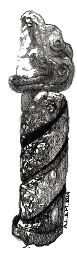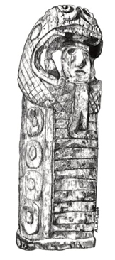 Afirma que el cuerpo de la sierpe corresponde a la misma sección del cuerpo del pene, mientras que la cabeza serpentina corresponde al glande (Barjau 2003, 26; figura 5).