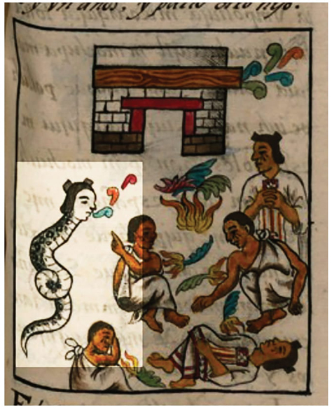 Al respecto, el referente que evidencia la personalidad femenina de la sierpe quimérica no se asocia directamente a un elemento de tipo arqueológico, sino a representaciones semejantes en varios documentos novohispanos, como el Códice florentino, en el que el discurso está acompañado de una imagen que remite al tema en cuestión. La foja 253 del tomo II muestra una escena en la que Cihuacóatl vocifera ante un grupo de personas en una aparente situación de penuria. El texto expone que en tiempos de Moctezuma II se hicieron notar varias manifestaciones místicas que revelaron el desastre que traería consigo la conquista; una de ellas tuvo que ver con la aparición del diablo: “Que se nombrara cioacoatl, de noche andava llorando, por las calles de Mexico: y lo oyan todos, diciendo. O hijos mios, guay de mi, que yo os dexo a vosotros” (Códice florentino, t. II, f. 253).
