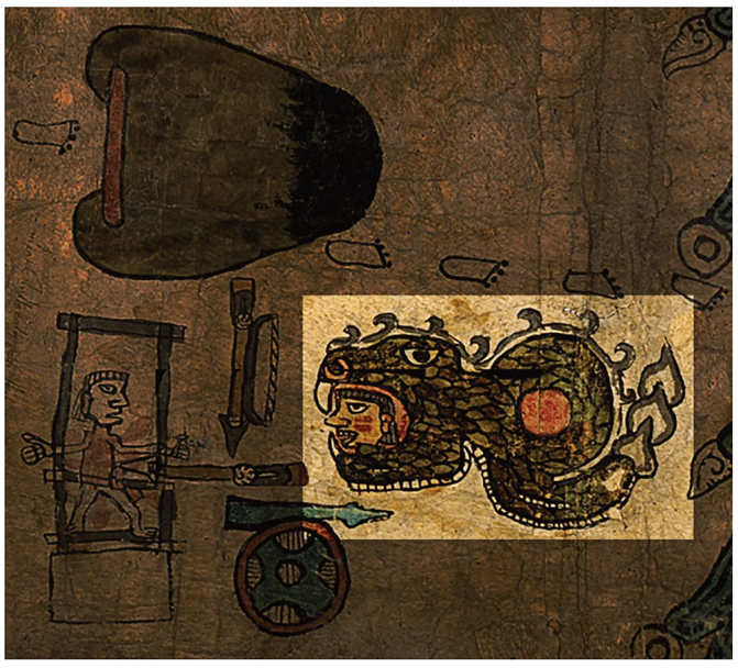 Figura 8 Ceremonia ocurrida en el cielo nocturno, probablemente referida a una conjunción astronómica presidida por dos deidades quiméricas antropo-serpentinas; destaca la figura de la izquierda como una posible representación de Cihuacóatl.