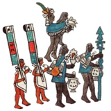 Cada uno de los que hacían procesión iba llevando en los hombros su tetewitl, [los mâsêwalli llevaban su Âmatetewitl y los Tlâlohkâwêweh, su Tlâkatetewitl]. |