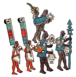 De esta manera se hacía procesión: los Tlâlohkâwêweh [que eran Chalchiwtli îkwê, Tlâlok y Ketsalkôwâtl] venían encontrándose con la gente por diversos lugares y la guiaban. |
