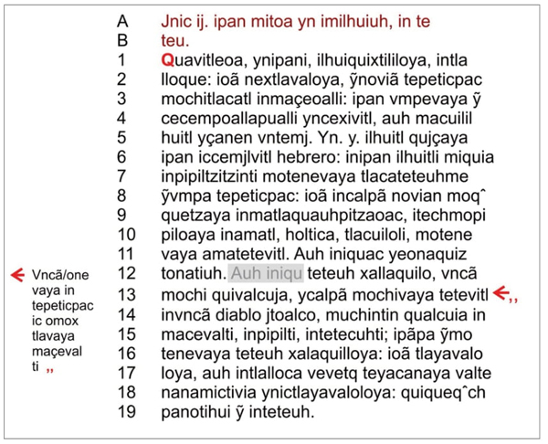 La primera palabra del texto es <Quavitleoa>, escrita con una <Q> titular. En el renglón 12 se detecta una secuencia <Auh iniqu> semiborrada, y al final del renglón 13, en el margen derecho aparece una indicación hecha mediante una flecha y comillas dobles, de color rojo, que señalan el lugar de la inserción de una apostilla que puede leerse en el margen izquierdo, escrita en siete renglones y que, por su longitud total, suponemos que se trataba de un renglón que el copista olvidó escribir.