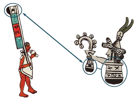 La segunda (5.2) está formada por dos verbos: {piloa}, ‘colgar’, y {tênêwa}, ‘nombrar’. El primero es de valencia 2 (o transitivo), aparece en impersonal, su objeto es el papel con diseños de hule y cuyo circunstancial de lugar es el mâtlak w awpitsâwak. El segundo verbo, {tênêwa}, ‘nombrar’, relaciona el nombre propio Âmatetewitl con los papeles con diseños de hule colgando del mâtlak w awpitsâwak. Esto nos permite leer que este objeto en su conjunto es un Âmatetewitl. Todo esto está representado en la esquina inferior izquierda del texto pictográfico, en el que vemos un Âmatetewitl como si fuera una bandera azul y rojo con taches negros, coronada o rematada en la parte superior con ciertos diseños negros sobre blanco e hincada frente a una casa. Nos llama la atención que se mencione que estos papeles pintados tengan diseños, y la pregunta es: ¿diseños de qué? En los Códices matritenses del Real Palacio hay una nota escrita por Sahagún que fue omitida en la versión del Códice florentino y que dice: “Esta fiesta hazian a honrra de quezalcoatl ques el dios de los viêtos matavan vn hombre côpuesto cô los ornamêtos o atavíos del mjsmo quezalcuatl dezian que era su imagen, matavanle a la media noche para amanecer al dia de la purificacion” (Sahagún 1561-1562, 54r). Esto respondería quién es el que muere en el patio, en la cima del cerro: muere Ketsalkôwâtl. La pregunta es si los Âmatetewitl representados en el texto pictográfico también tienen alguna relación con Ketsalkôwâtl, al ser todos ellos tetewitl; y al observar la descripción de Ketsalkôwâtl en los Primeros memoriales (Sahagún 1559-1561, 267r) identificamos que el objeto que lleva en su mano (llamado <chiquacolli> en el documento) tiene los mismos ornamentos que están pintados en la parte superior del Âmatetewitl. Podemos leer, entonces, que los diseños de los Âmatetewitl tenían en su parte superior indicado a quién se le celebraba la fiesta, en este caso, a Ketsalkôwâtl como uno de los Tlâlohkeh (Rodríguez 2010, 165) (véase la figura 3).