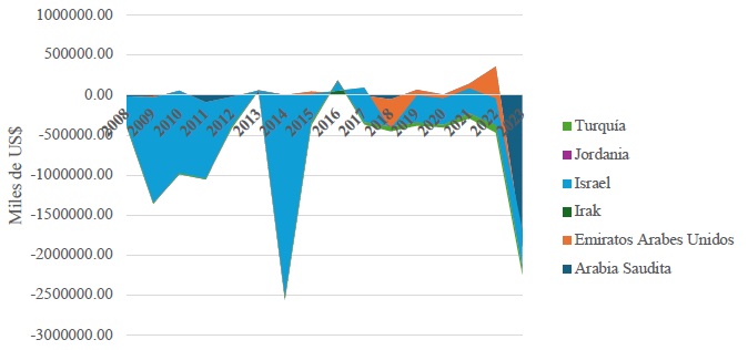 Gráfica 3 Balanza comercial de Costa Rica con países seleccionados de Medio Oriente (2008-2023)