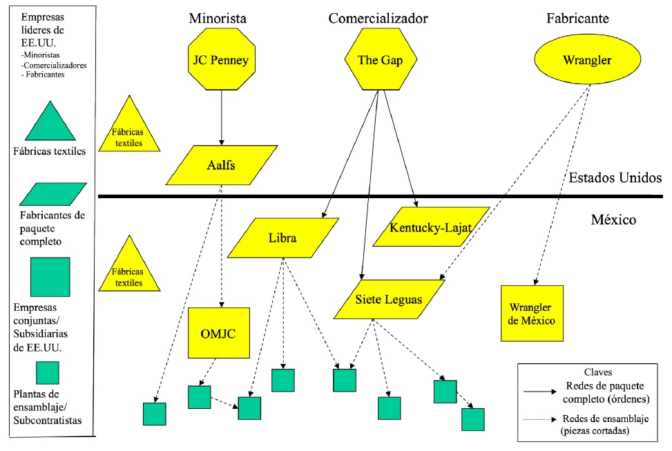 Empresas clave: el principal factor de desarrollo en este caso es el cambio en la estructura de la industria mexicana de confección, que pasó de depender de las plantas de ensamblaje en el sector maquilador, que florecieron a lo largo de la frontera durante la década de 1980 y principios de la de 1990, al auge de los proveedores de ropa de “paquete completo” que surgieron tras la aprobación del TLCAN en 1994 (véase la gráfica 1). En 1993, los principales clientes estadounidenses de los pantalones de mezclilla confeccionados en Torreón eran cuatro grandes fabricantes: Levi Strauss, Wrangler, Farah y Sun Apparel. Para el año 2000, a estas empresas se unieron las predominantes cadenas minoristas estadounidenses (JC Penney, Sears, Kmart, Walmart y Target), los destacados minoristas especializados en prendas de vestir (Gap y Limited) y comercializadoras que vendían una amplia variedad de marcas de moda (p. ej., Liz Claiborne, Donna Karan, Tommy Hilfiger, Calvin Klein y Polo/Ralph Lauren).40