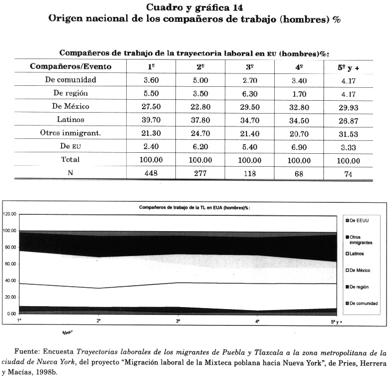 En los cuadros y las gráficas que se ofrecen a continuación (11, 12, 13 y 14) puede observarse que la mayor parte de los patrones de los mexicanos en Nueva York está constituida por migrantes que pertenecen a olas migratorias anteriores; mientras que entre los compañeros de trabajo se encuentran sobre todo integrantes de diversos grupos inmigrantes y es casi imposible localizar entre ellos a anglosajones o afroamericanos. Aunque cabe señalar que, en el caso de las mujeres, a lo largo de sus trayectorias laborales en Nueva York tienden a contratarse en mayor medida con personas identificadas como "blancas", pero no migrantes, en tanto que los hombres se mantienen en mayor medida trabajando con patrones inmigrantes de diversos orígenes.