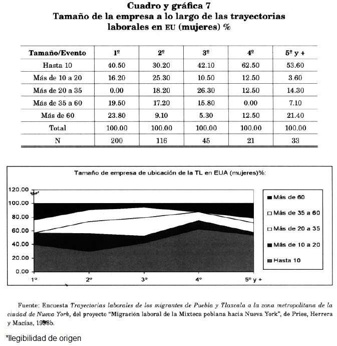 En séptimo lugar, por las condiciones laborales específicas de los nichos de este mercado de trabajo segmentado y segregado, se sitúan en los límites de la ilegalidad, en establecimientos pequeños o muy pequeños, con tecnologías muy atrasadas, tareas descalificadas, jornadas de trabajo diarias y semanales muy prolongadas, sin prestaciones, en condiciones generalmente insalubres, con contratos sólo verbales, por debajo de, o cuando mucho, en el nivel del salario mínimo, sin pago de horas extra, pero con la obligación de laborarlas (cuadros y gráficas 7, 8, 9 y 10).