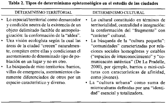 En segunda instancia, el asunto que más me preocupa dirimir es el de la problemática del recorte del objeto, en su vinculación con los presupuestos teórico-metodológicos que han marcado a fuego a la antropología en general sobre los cuales en la actualidad se ha reflexionado críticamente. Esta cuestión no sólo permitirá desentrañar si estamos ante un tema de escala del objeto, sino, y como considero, del objeto en sí mismo. La pregunta fundamental es: ¿cómo pensar lo urbano en términos de "objeto etnologizable" sin contribuir al fortalecimiento de preconceptos fuertemente establecidos? (ver tabla 2).