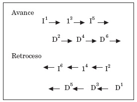 Figura 6) Con la iniciativa del monarco, todos los danzantes retroceden de espaldas de cinco a diez metros, sin perder de vista la cruz. Llegado al final del recorrido, mantienen el paso en ese lugar por unos momentos y avanzan de frente a la cruz los mismos metros retrocedidos hasta colocarse en la posición inicial. Al final del recorrido de retroceso se pueden realizar algunas figuras, como el cruce de filas o giros de 3600. Como variante de esta figura de avance y retroceso de filas, el monarco se gira para dar la cara al grupo en todo momento, tanto al retroceder como al avanzar, o bien le da la cara al grupo cuando éste retrocede y la espalda cuando avanza. Pueden alternarse varias posibilidades al gusto del monarco.