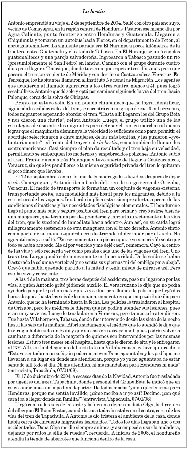 El riesgo de sufrir un accidente y quedar imposibilitado físicamente para proseguir el viaje es también muy común en esta porción de la frontera. Y es que quedarse no siempre se desprende de una decisión voluntaria. Las circunstancias, la mayoría de las veces adversas, modifican drásticamente las trayectorias migratorias de los centroamericanos indocumentados en Chiapas y, en general, en todo el territorio mexicano. El único sitio en todo el país habilitado para la recuperación de migrantes accidentados y lesionados en el camino está ubicado en Tapachula: el albergue Jesús El Buen Pastor -cuya fundadora, Olga Sánchez, fuera investida con el Premio Nacional de Derechos Humanos en 2004-. La casa es frecuentada por centroamericanos, migrantes de otras nacionalidades e incluso mexicanos, que llegan a recuperarse de sus heridas y lesiones. Provienen de Chiapas, Tabasco, Veracruz o cualquiera de los estados de la República, transportados por algún consulado centroamericano, por personal del Grupo Beta12 o en ambulancia, desde algún hospital público. Unos pocos migrantes viven permanentemente allí, como Antonio, un hondureño que cayó del tren de carga en septiembre de 2004 y todavía se recupera de sus lesiones.