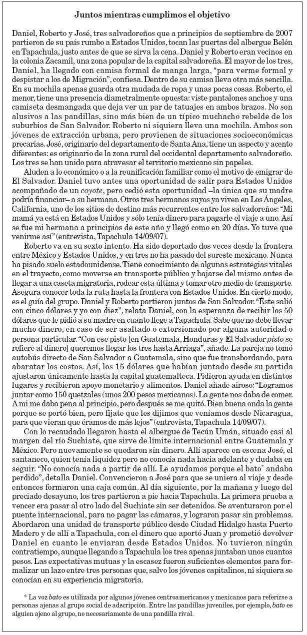 El caso ejemplifica que, durante el tránsito, la confección de vínculos y la búsqueda de apoyo en las redes sociales preexistentes es un modo de acción social orientado a disminuir los riesgos. Como se puede apreciar, los vínculos que habilitan esas redes -de paisanos, para este caso- se tejen para fines específicos (llegar a Estados Unidos), siendo la fugacidad una de sus características, lo cual no desmerita que al fin y al cabo sean redes. No obstante, pueden documentarse casos en que la construcción de vínculos más fuertes y duraderos viene a formar parte de las estrategias utilizadas por los migrantes para enfrentar las situaciones adversas de su vida cotidiana, como se muestra en el siguiente ejemplo.