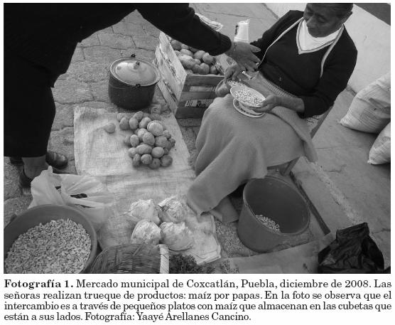 Con respecto al intercambio, en algunos mercados como Ajalpan y San Sebastián Zinacatepec, los vendedores flotantes hacen trueque o ferian todos los productos posibles, desde un chile hasta un canasto de xoconostle (Stenocereus stellatus). Normalmente los productos que se ferian son de baja calidad, los más maduros, lo rezagado, lo que ya no se vendió. El maíz y el pan del día son los principales productos que se intercambian a través de diversos mecanismos. Como una particularidad regional, en Coxcatlán y San Sebastián es común ver personas (compradores) que traen una bolsa con maíz que colocan en recipientes pequeños como platos o jícaras y lo cambian por productos como fruta, leña, tortillas o ropa (fotografía 1); de hecho el maíz no es un producto que se oferte en los puestos pequeños, sólo se usa para intercambio.